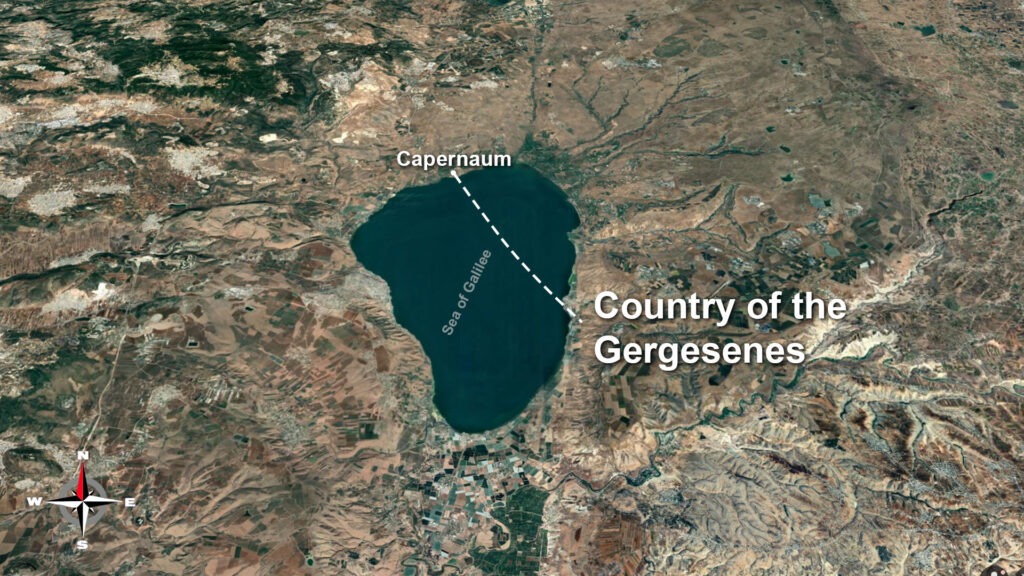 Capernaum is on the north, northwest shore of the sea of galilee. So when it’s talking about the other side of the lake, it’s most likely referring to the south eastern shore of the sea of galilee.
