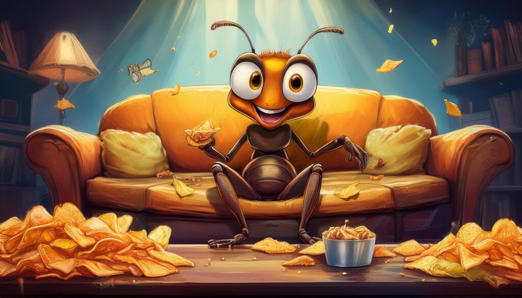 This is not what an ant does all day. An ant doesn’t sit on the couch eating chips, watching TV, scrolling on the phone, and playing video games.