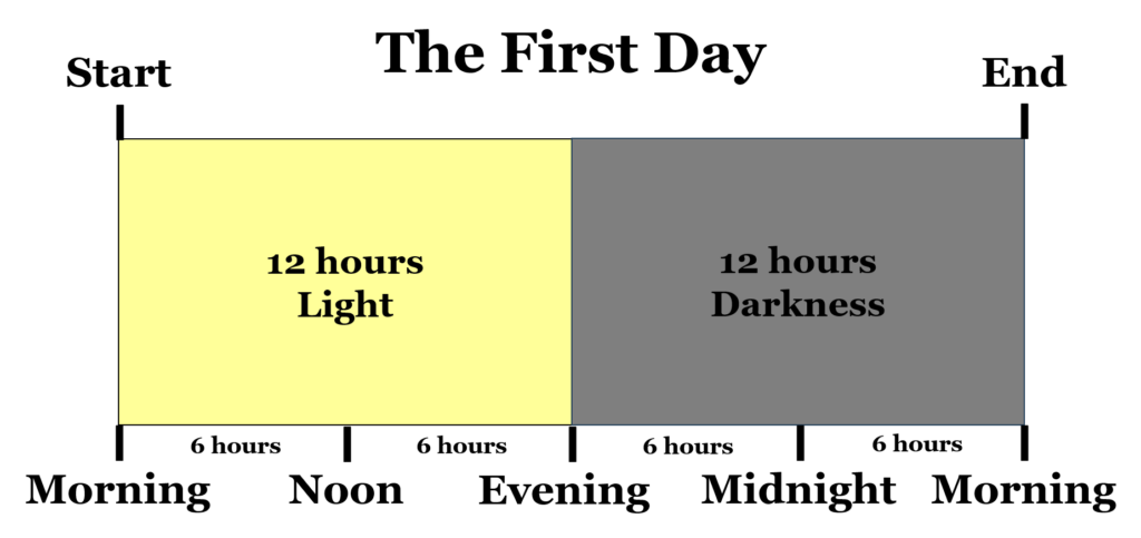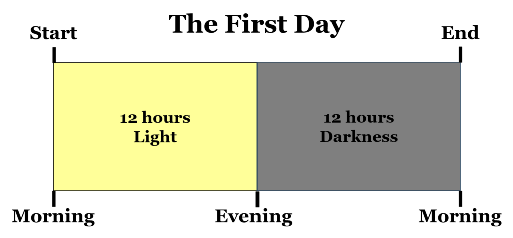 Notice that the sentence “And the evening and the morning were the first day” doesn’t say that darkness is first and that light is second. That phrase gives us two points within a day. Those points in time are evening and morning. A day also consists of other points.
